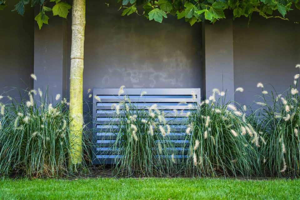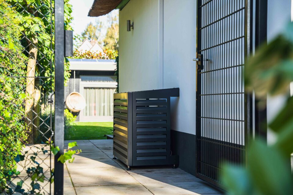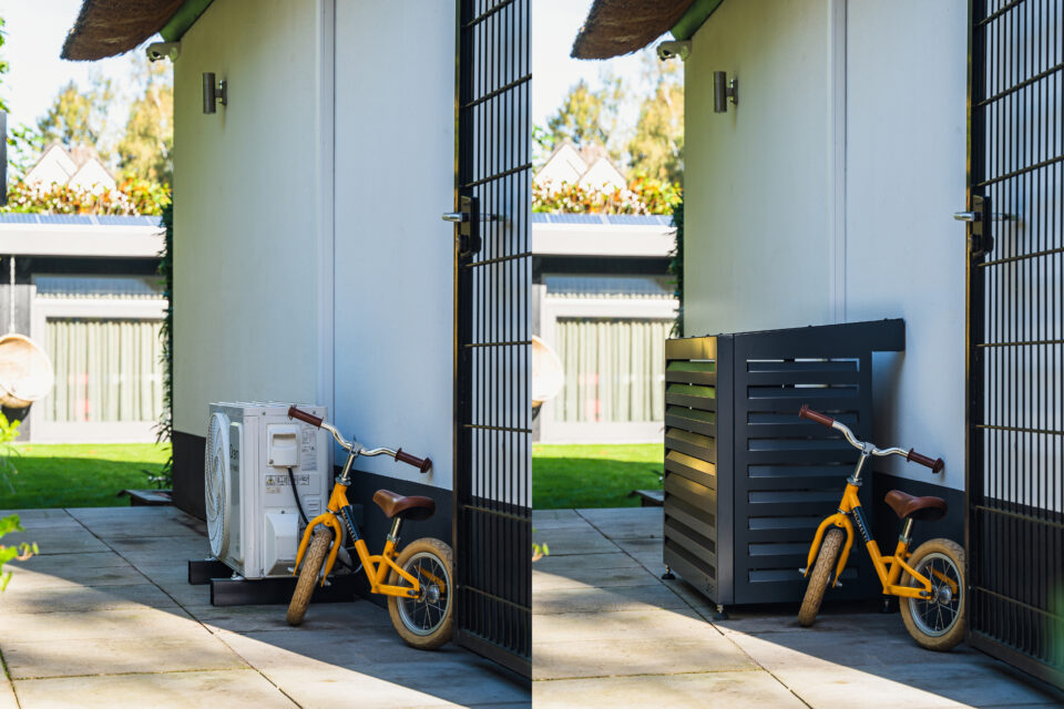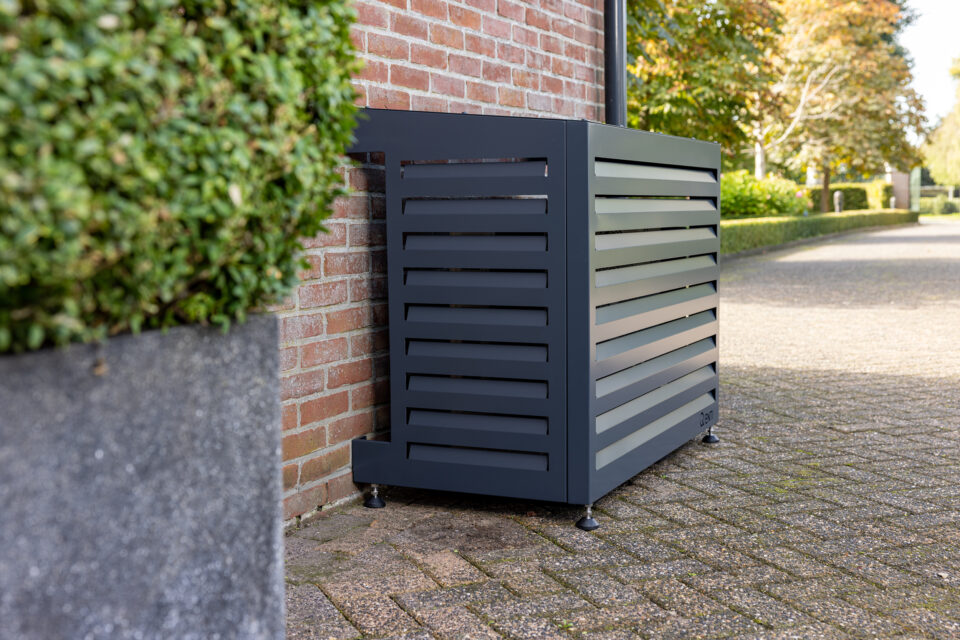 Stilfuld og funktionel varmepumpeskjuler i aluminium, designet til at give din udendørs enhed et mere diskret og æstetisk udtryk. Kabinettet reducerer visuel støj i omgivelserne og beskytter samtidig varmepumpen mod vejr og slid.